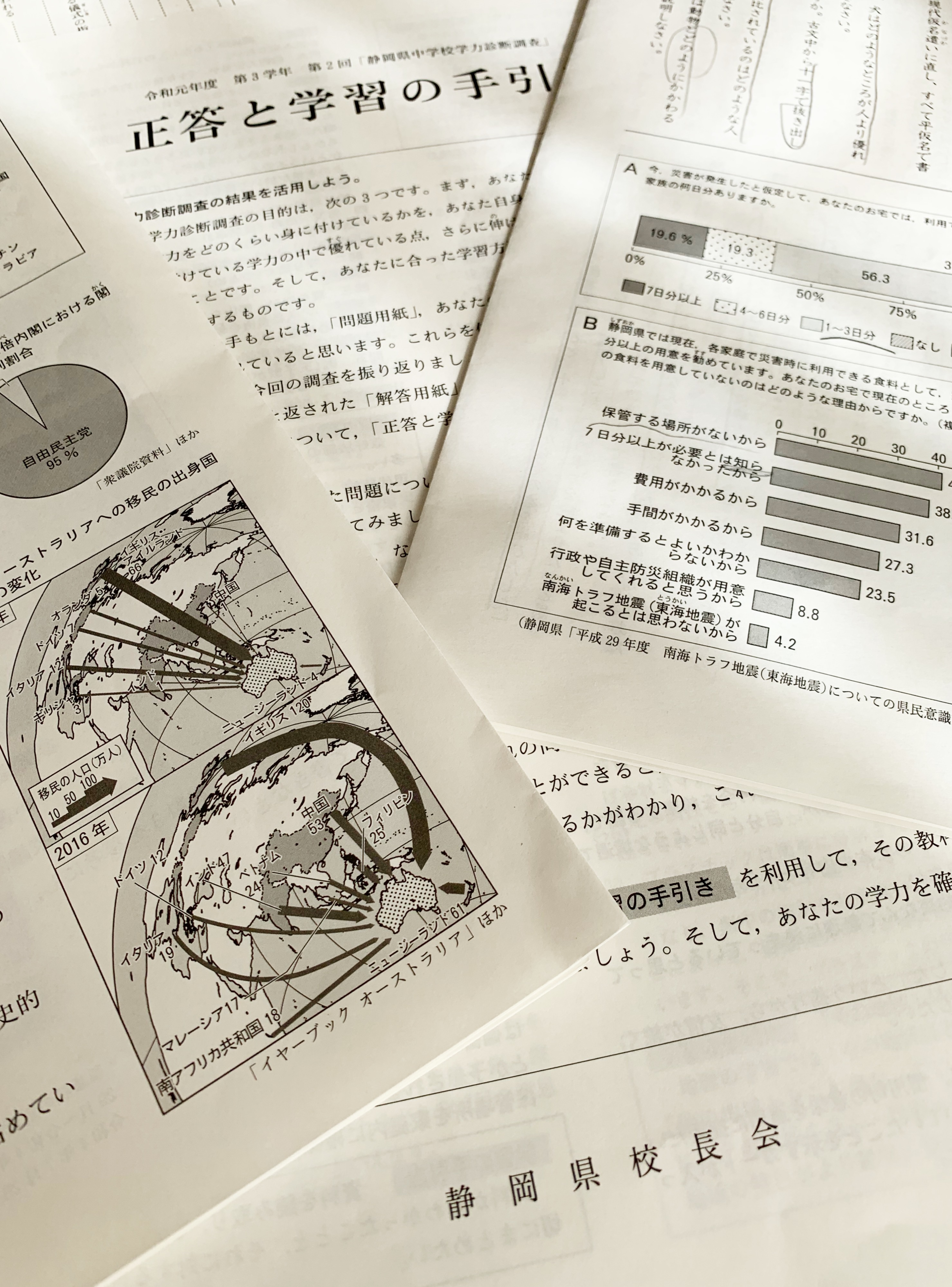 学調の話に戻しましょう。静岡県校長会の名が表面に記載されている「正答と学習の手引き」によると、「中学3年生にふさわしい学力をどのくらい身につけているか、あなた自身が知ることです」と書かれています。「ふさわしい」とは一体なんでしょうか?知識偏重の試験問題に向けて勉強させることは、すでに場違いです。静岡の高校入試問題と学力調査には、静岡県民のため、日本のため、世界のためにも旗振り役となってもらいたいです。