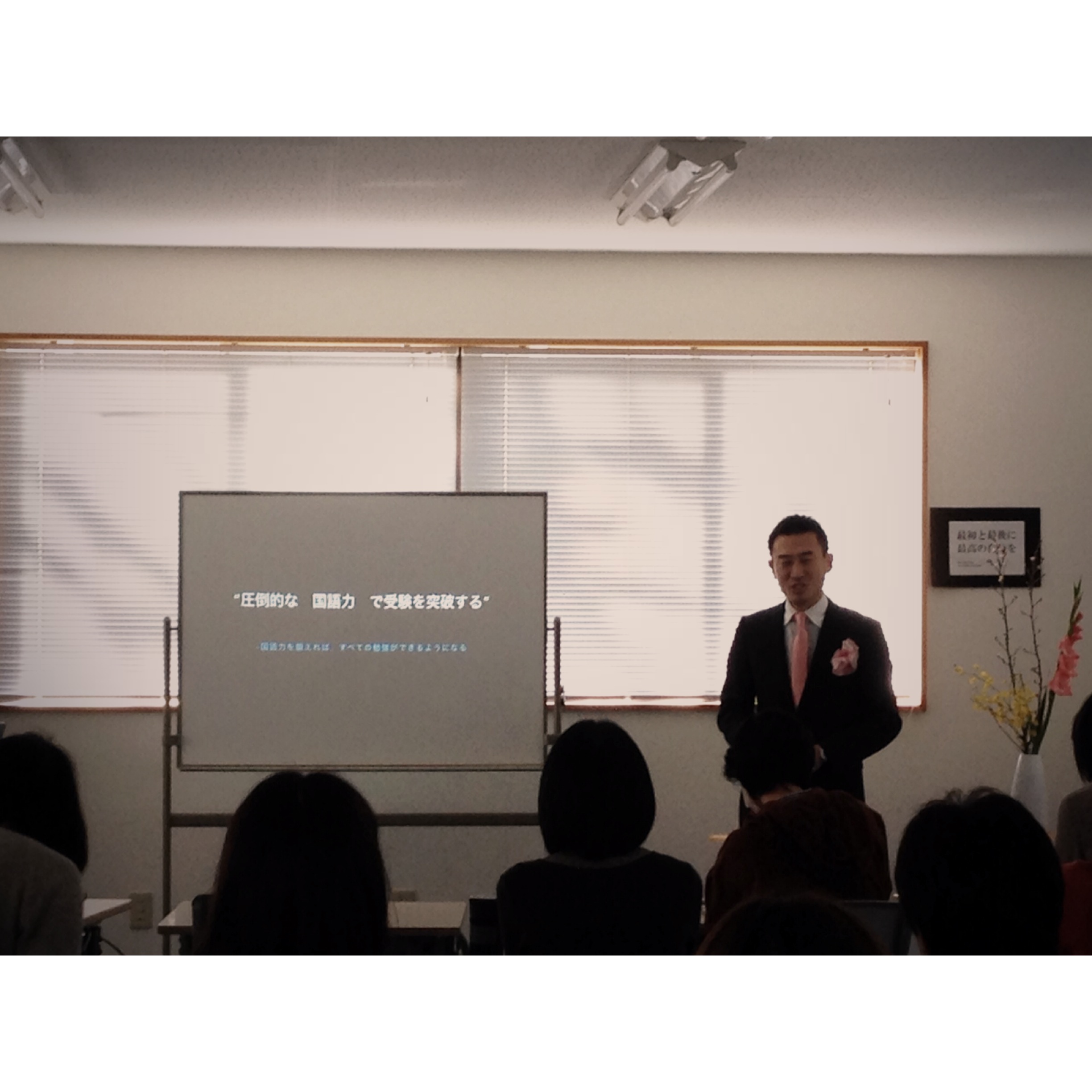 週末、本田健氏のセミナーでいただいたお花を生けて臨んだ説明会(写真右端)。素敵な「気」をいただいたようで会場が華やかな雰囲気に包まれました。今回の説明会も満員御礼、お集りいただいた親御さまに感謝です。またスタッフのみんなに支えられて、運営ができたことにも本当に感謝です。