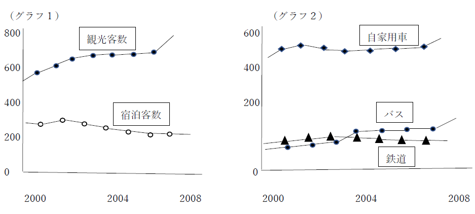 今週の意見を育てるニュース教室では、ある観光地の2000年から2008年にかけての統計データを読み解くトレーニングが行われました。