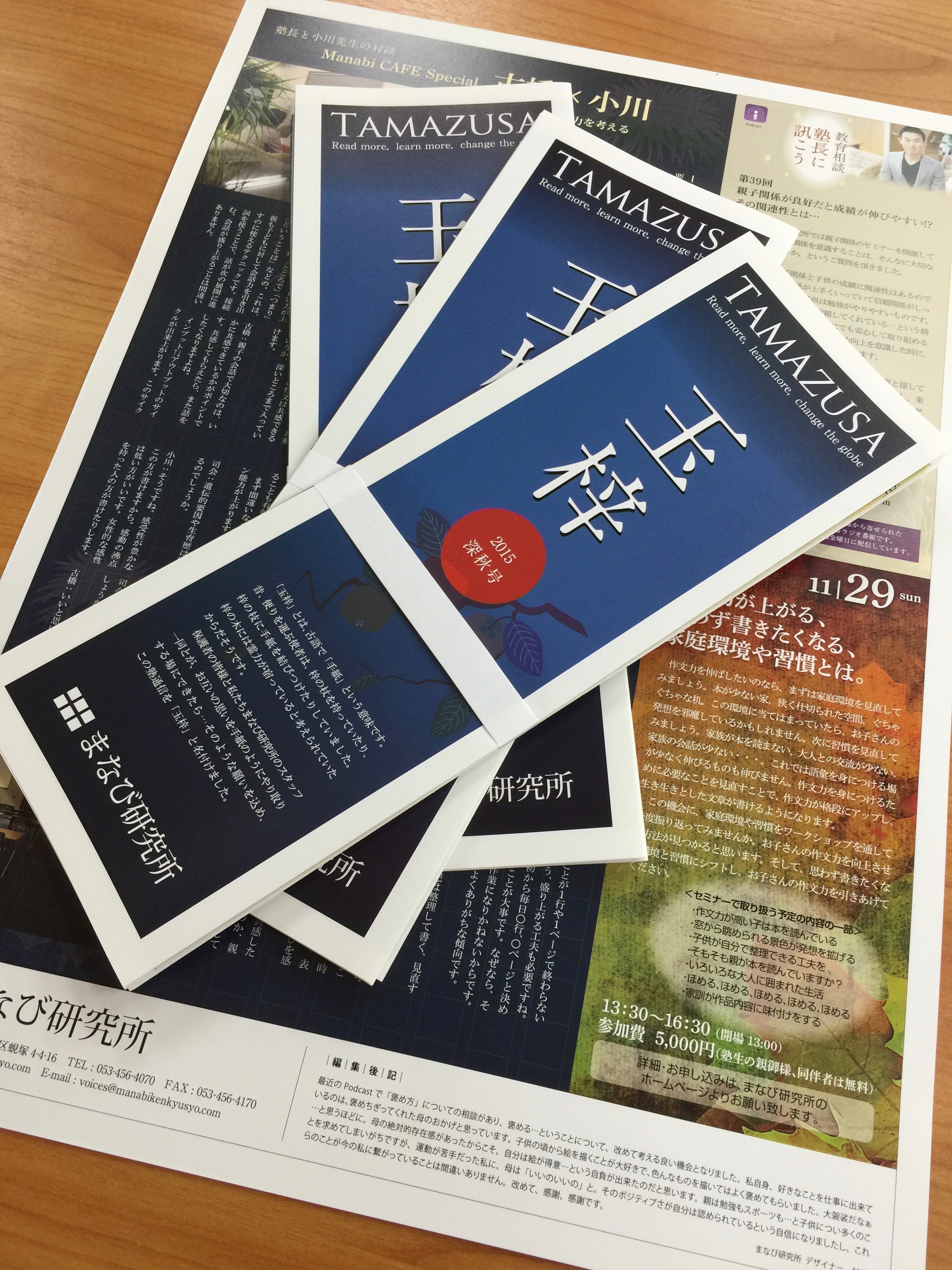 本日より、まなび研究所の塾通信「玉梓:深秋号」の配布を開始しました。今号は「作文特集」です。私が今感じていることや、小川先生(作文・小論文担当)と私の対談を掲載。皆さんのお役に立てたらと思います。玉梓を読んで取り組まれた感想を是非聞かせてくださいね。