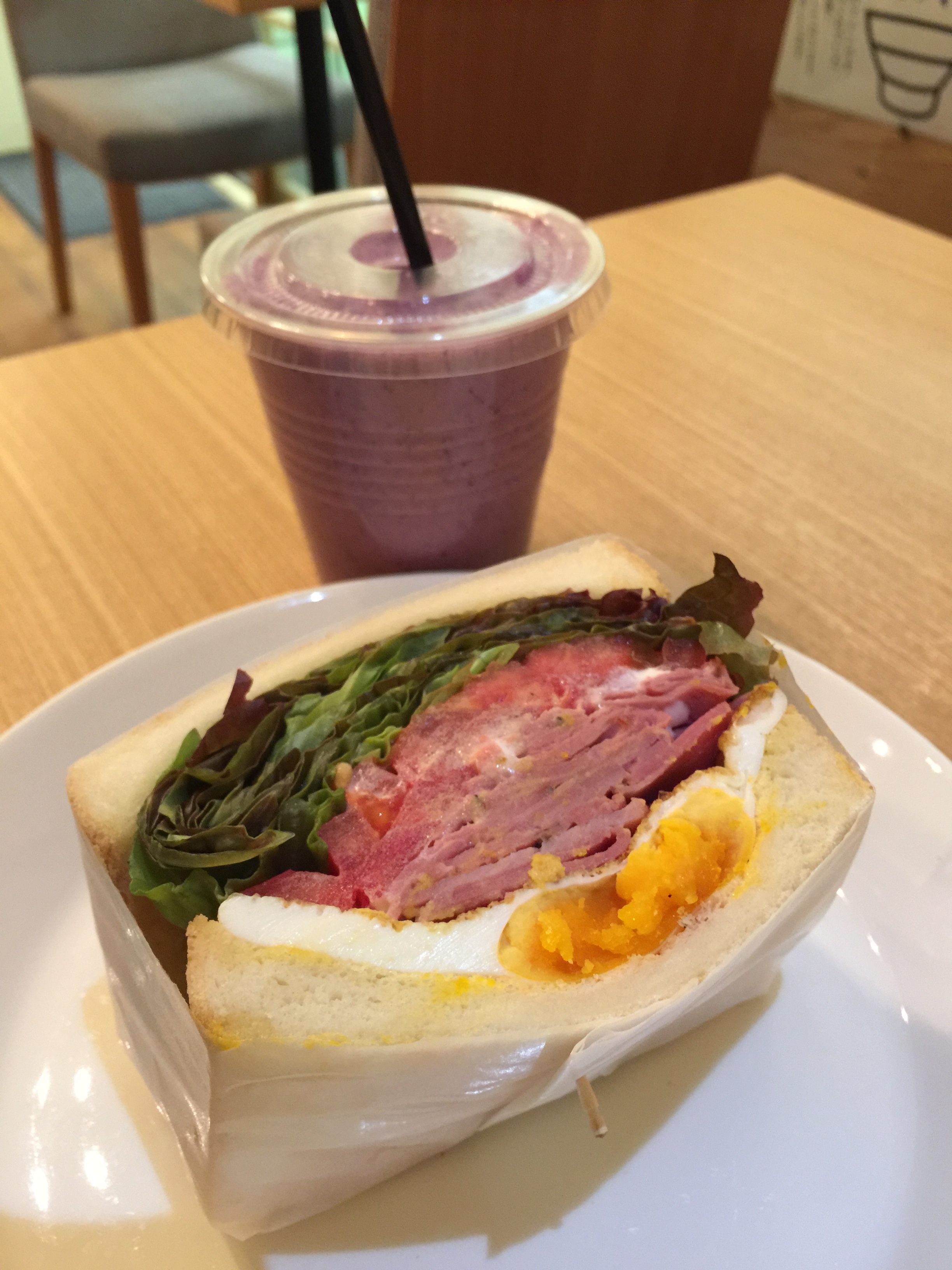 もっと広げて周りを見ると、一緒に添えられたスムージー、明るく綺麗な店内、笑顔を絶やさない店員さん。おかげで、私にとって忘れられない「BLTEサンド」になりました。